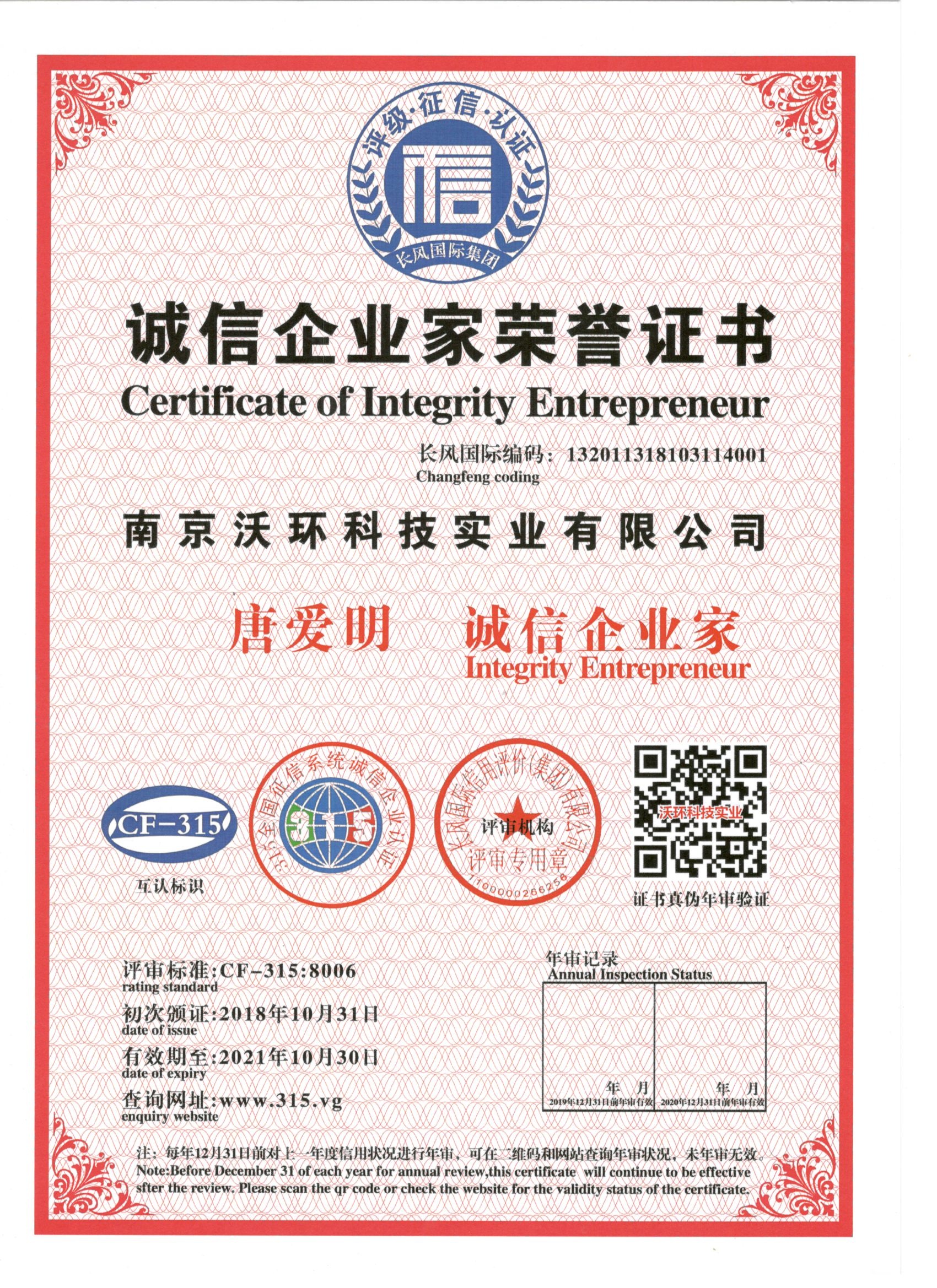 熱烈祝賀南京沃環(huán)公司唐愛(ài)明先生被專(zhuān)業(yè)評(píng)審機(jī)構(gòu)-長(zhǎng)風(fēng)國(guó)際集團(tuán)評(píng)為誠(chéng)信企業(yè)家,特發(fā)此證書(shū)